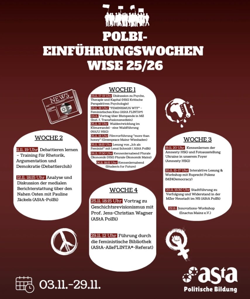 Wenn ihr dabei sein wollt, schriebt einfach eine Mail an politischebildung@asta.uni-mainz.de oder eine Instagram-DM an politischebildung.asta.jgu. Versucht 20 Minuten früher am Platz der Mainzer Republik zu sein (also 14:40). Wir freuen uns auf euch!
