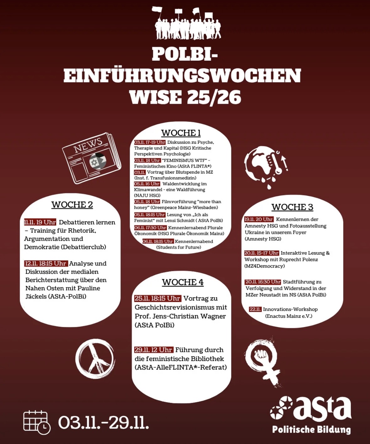 Unser AStA-Arbeitsbereich PolBi bietet euch wieder, gemeinsam mit weiteren Hochschulgruppen und tollen Gästen, ein dreiwöchiges Veranstaltungsprogramm, das euch die Möglichkeit bietet, euch am Campus mit verschiedenen politischen und gesellschaftlichen Themen kritisch auseinanderzusetzen, diese zu diskutieren und euch untereinander zu vernetzen. Egal ob ihr neu oder schon länger an der Uni seid, legen wir euch ans Herz, bei Veranstaltungen zu euren spezifischen Interessen vorbeizuschnuppern. Angesichts der aktuellen Krisen denken vielleicht manche über das Zuschauen und Mitdiskutieren während einer Veranstaltung hinaus darüber nach, sich sozial und/oder politisch zu engagieren. Daher lassen sich neben Vorträgen und Lesungen einige Kennenlern- und Erstiveranstaltungen im Programm finden.