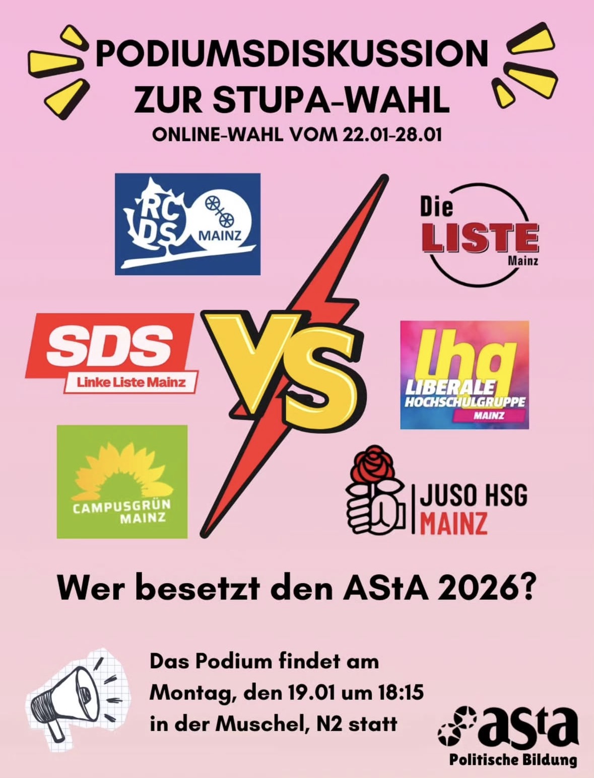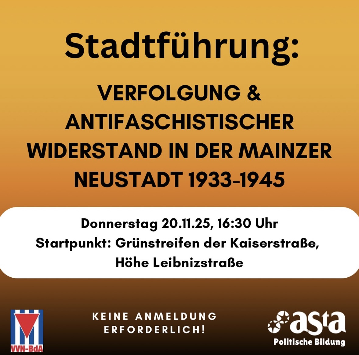 Da wir nur eine begrenzte Anzahl an Plätzen haben, schreibt uns bitte zur Anmeldung eine DM oder eine Mail an (politischebildung@asta.uni-mainz.de) mit Eurem Vor- und Nachnamen inklusive Adresse.